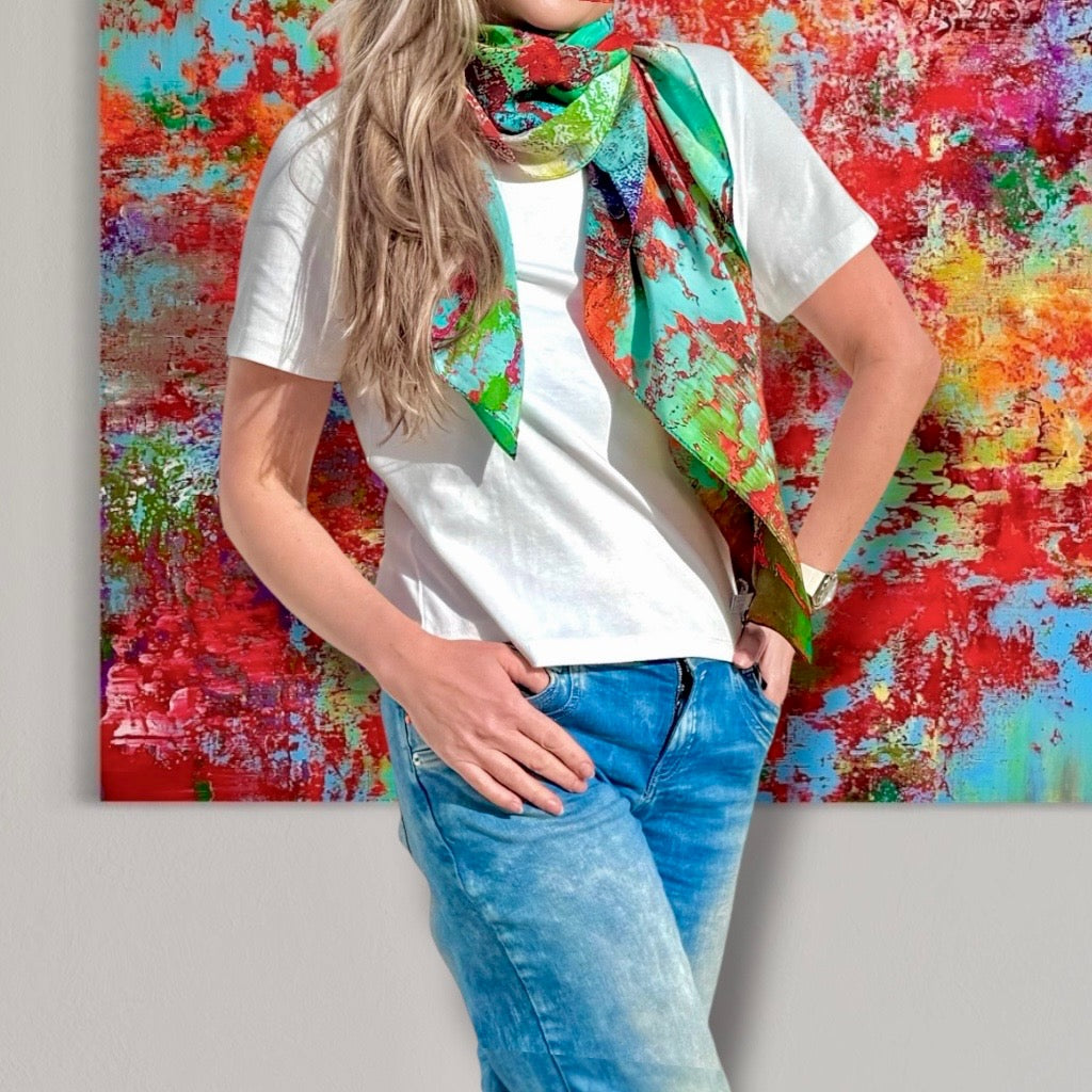 Each scarf is a true fusion of Art and Fashion, showcasing an original painting of Natalia Brooks as the foundation of its design.
