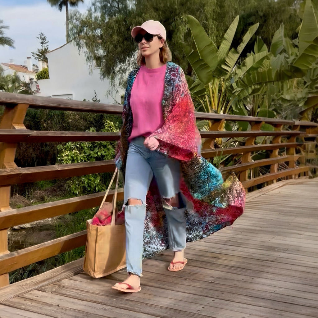 Dieses vielseitige Kleidungsstück ist für jede Jahreszeit geeignet und lässt sich das ganze Jahr über zu unterschiedlichen Outfits kombinieren. Der Kimono hat einen einzelnen Knopf im Brustbereich, sodass Sie den Look variieren können. Im Sommer lässt er sich mit Shorts und einem schlichten Top kombinieren oder als Bluse tragen, indem Sie nur den Knopf schließen. Im Winter kann er als Jacke über einem T-Shirt, einer Hose oder Jeans getragen werden.