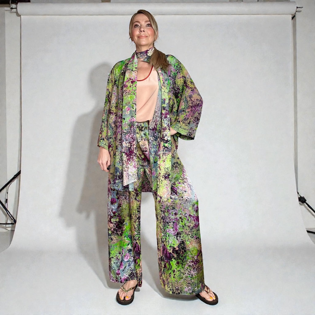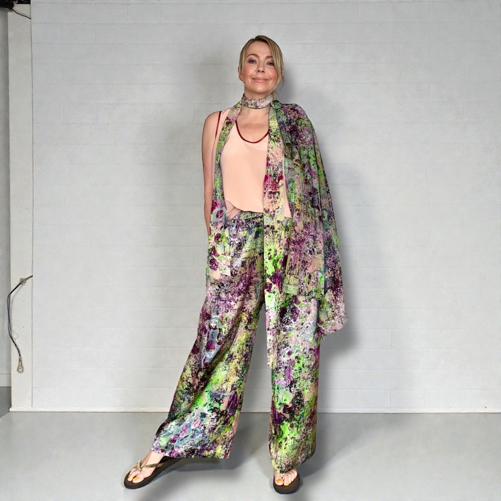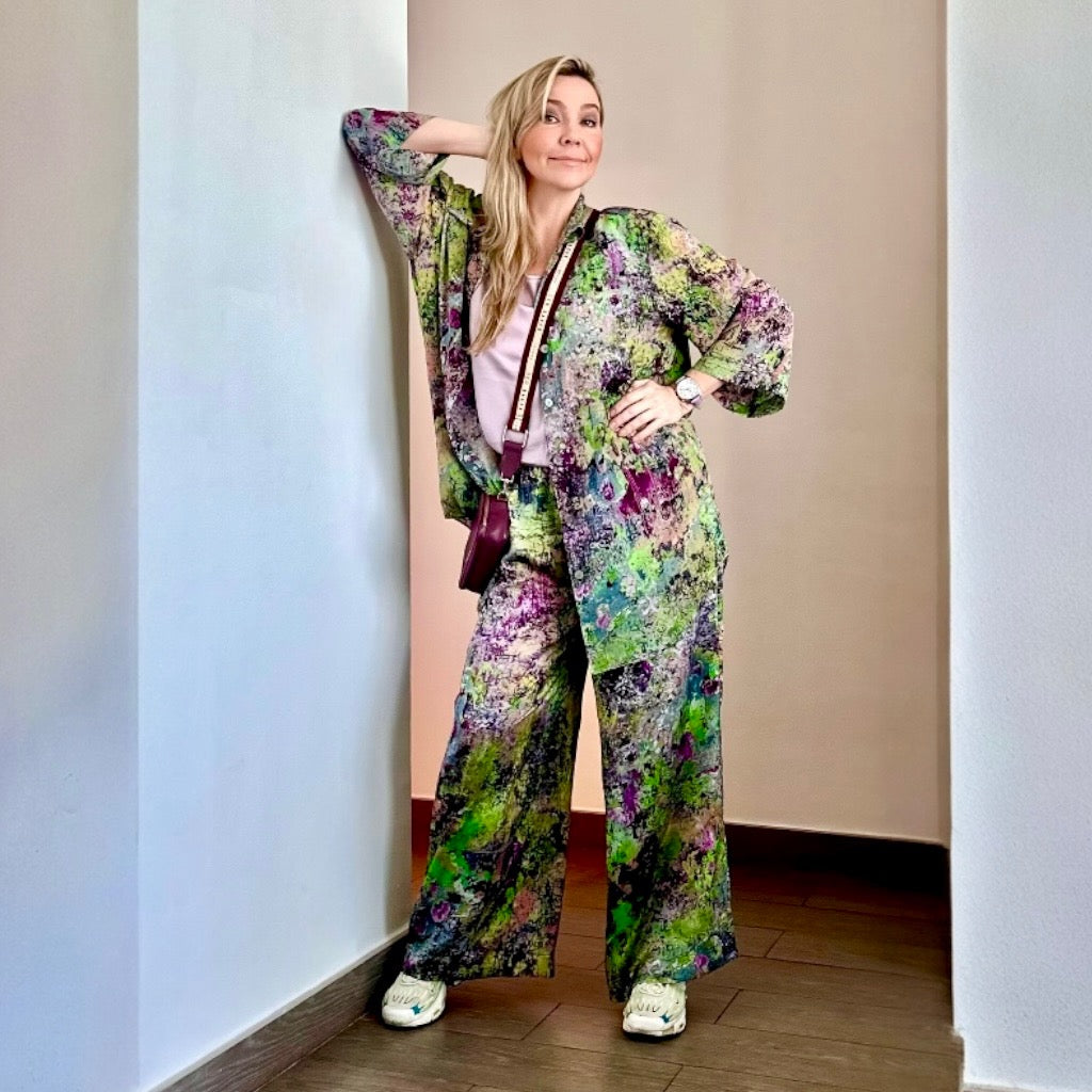 Dieses Set aus 100 % Seide, gewebt und bedruckt in Como, Italien, lässt sich, wie auf dem Foto gezeigt, vielseitig kombinieren. Unser Model trägt einen Seidenschal. Ein 200 x 8 cm großes Oberteil aus der gleichen Capsule Collection und ein einfarbiges Top darunter ergeben ein mehrlagiges Set und runden den Look ab.