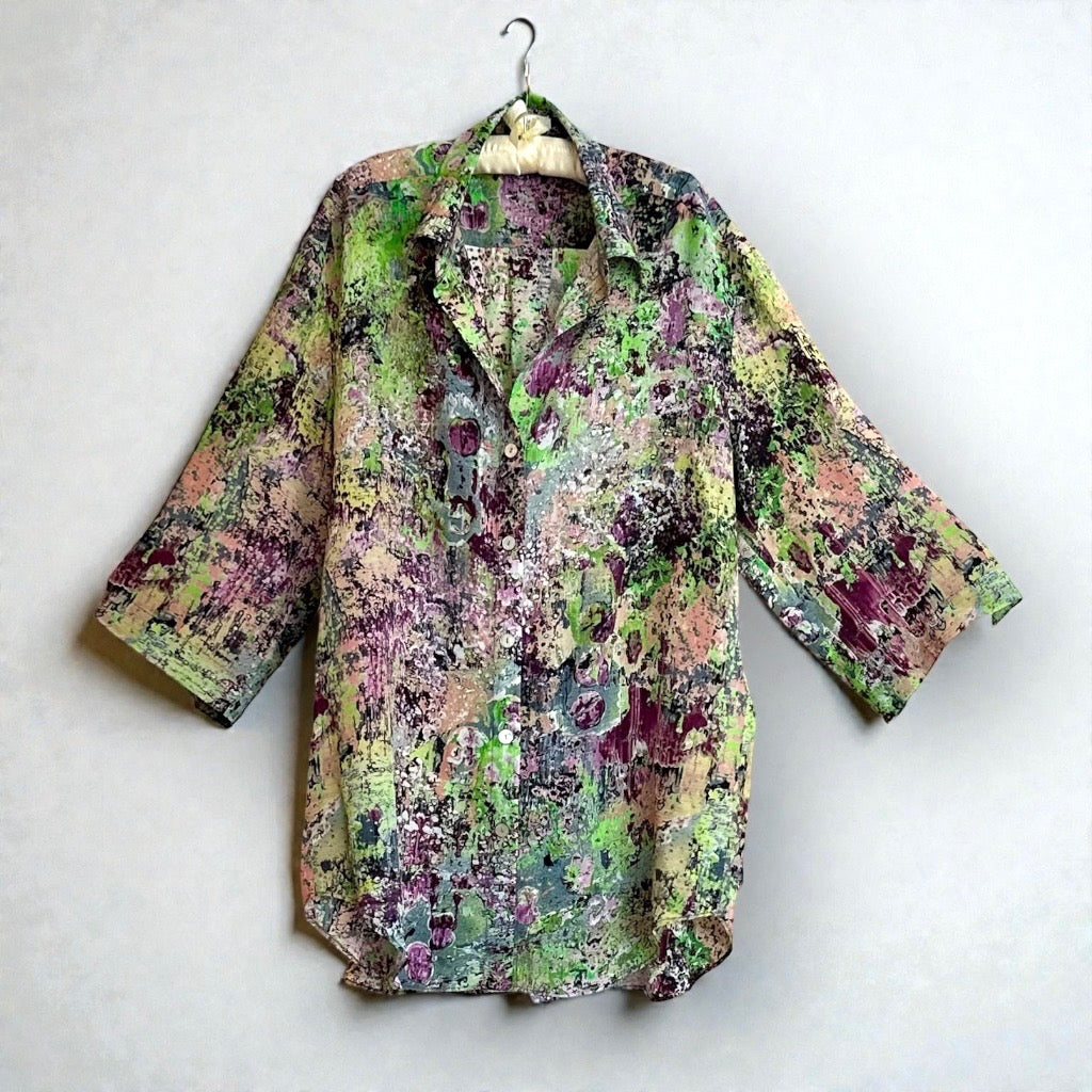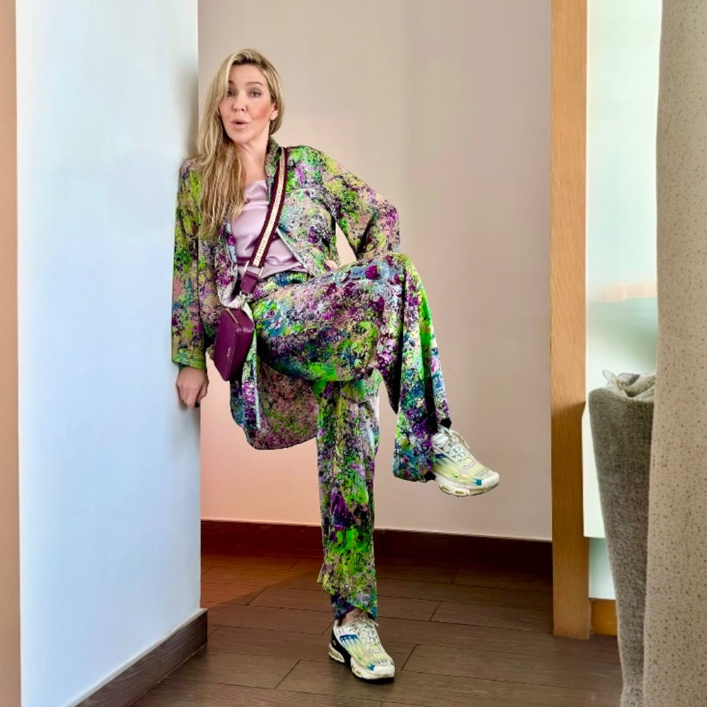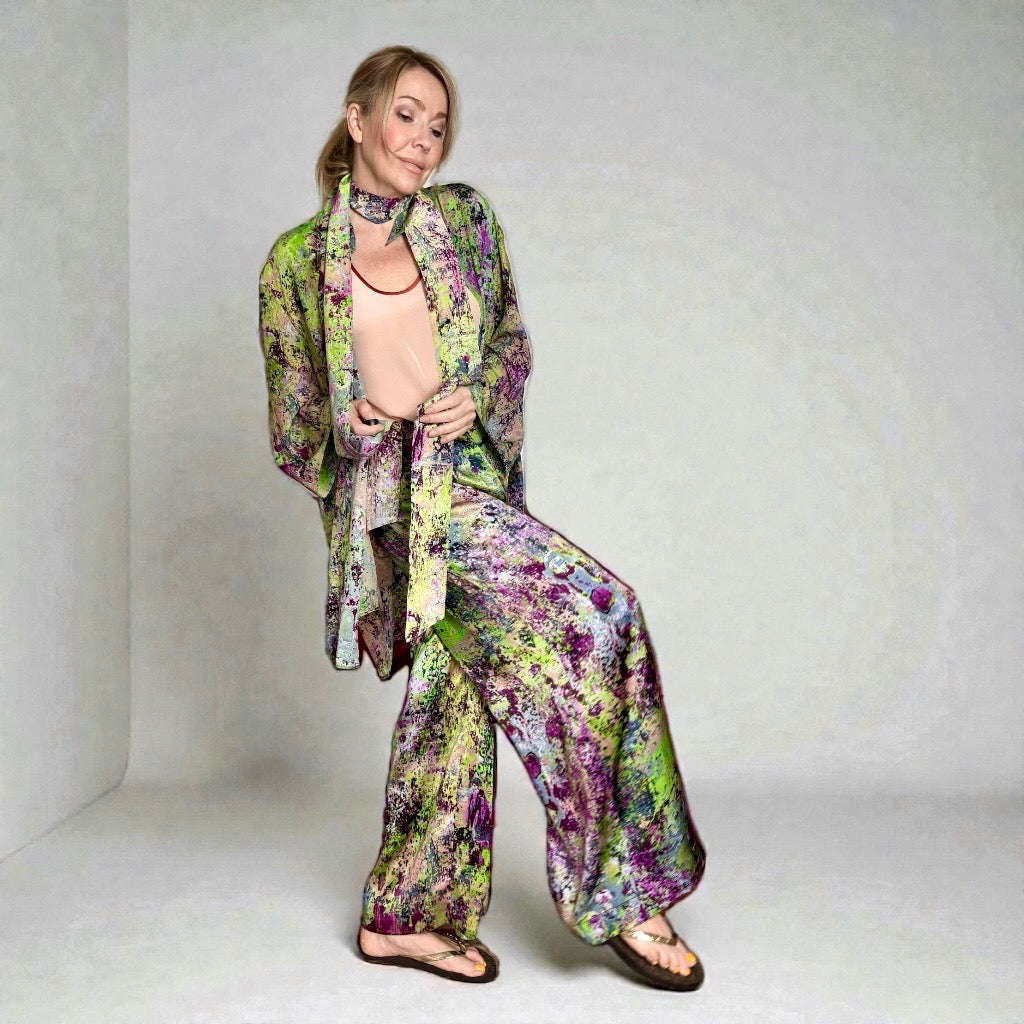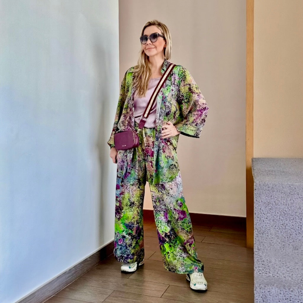 Dieses Set aus 100 % Seide, gewebt und bedruckt in Como, Italien, lässt sich, wie auf dem Foto gezeigt, vielseitig kombinieren. Unser Model trägt einen Seidenschal. Ein 200 x 8 cm großes Oberteil aus der gleichen Capsule Collection und ein einfarbiges Top darunter ergeben ein mehrlagiges Set und runden den Look ab.